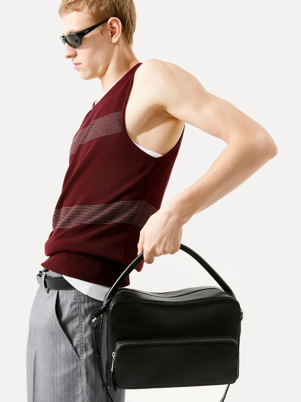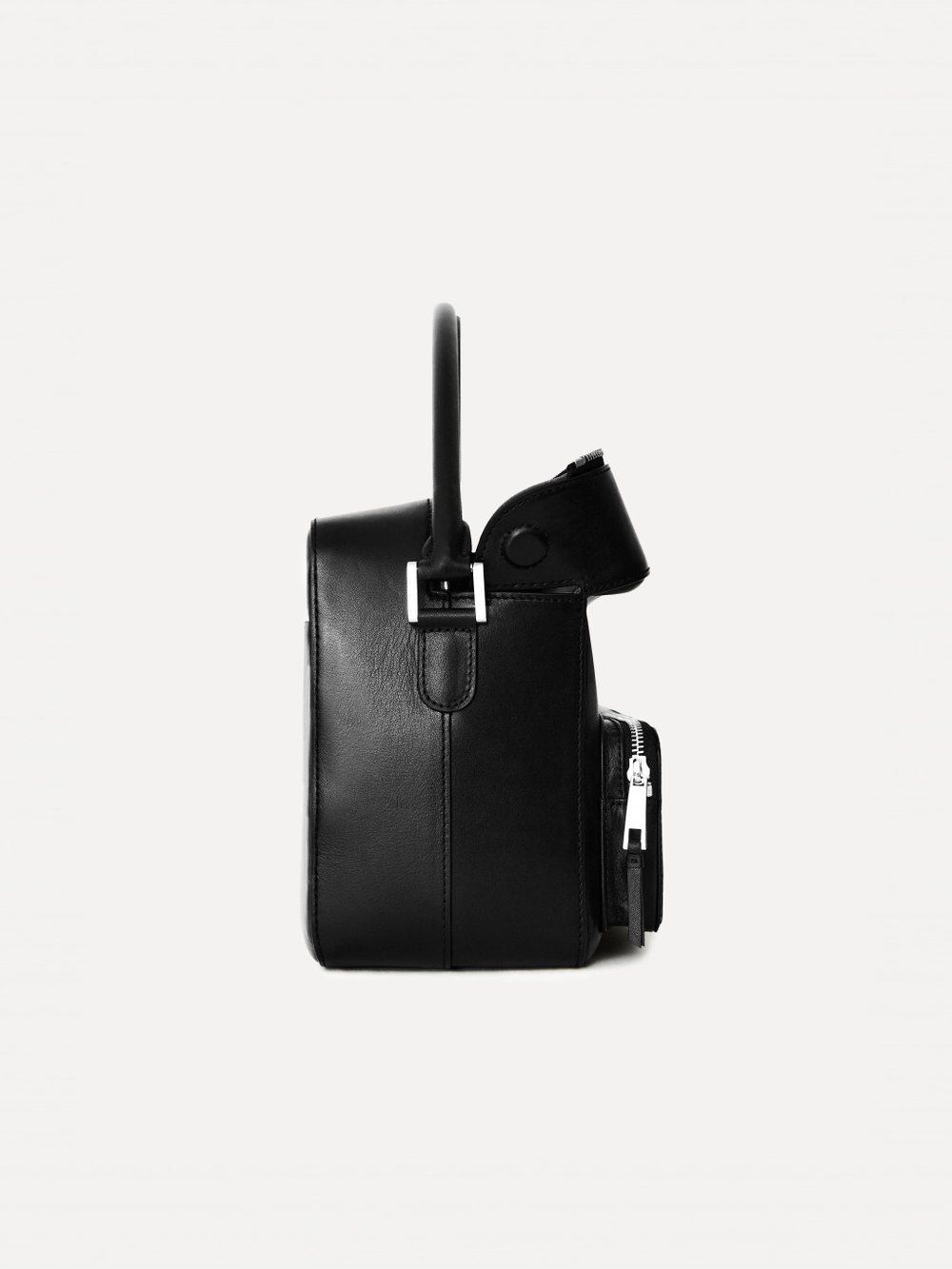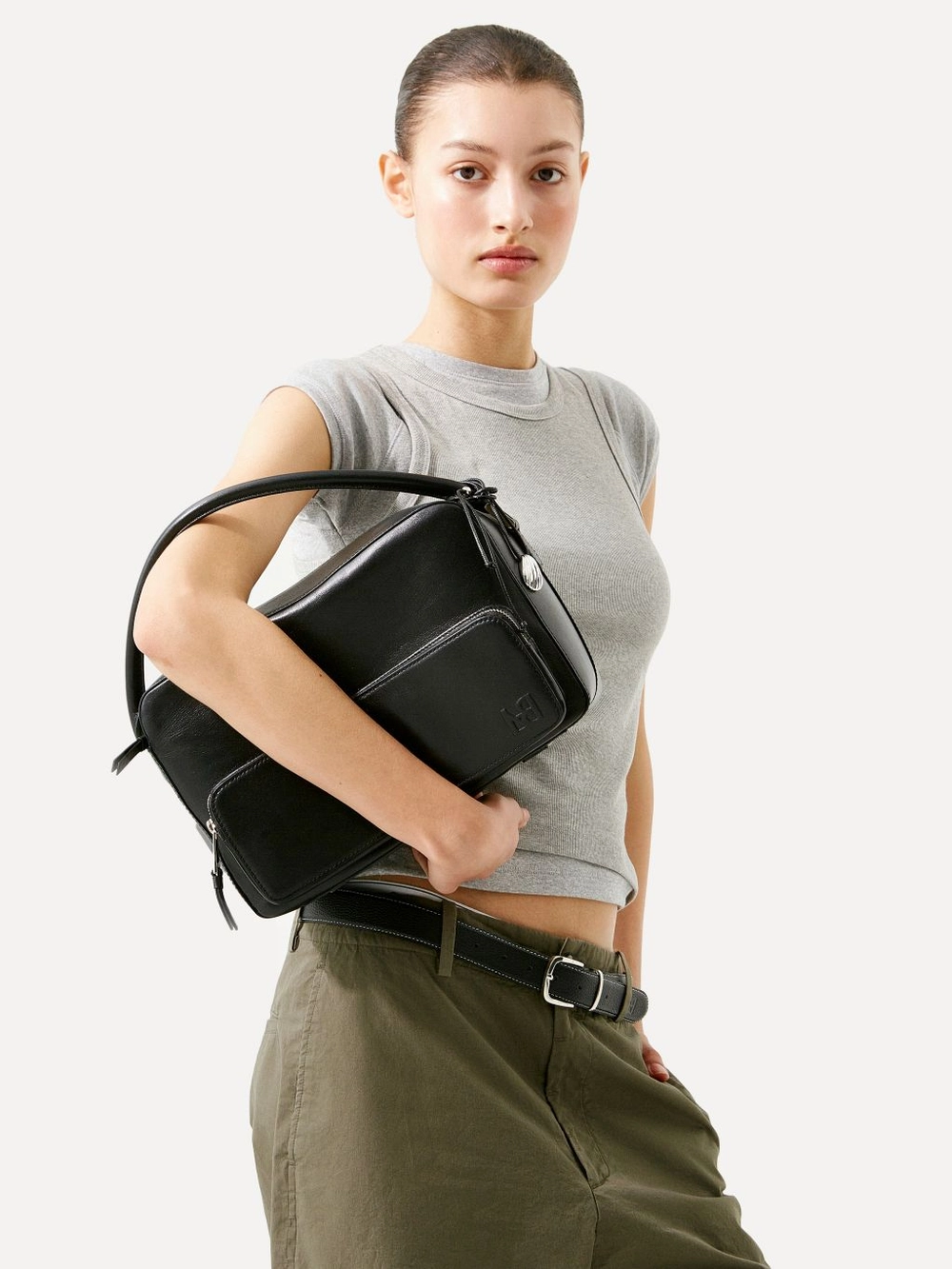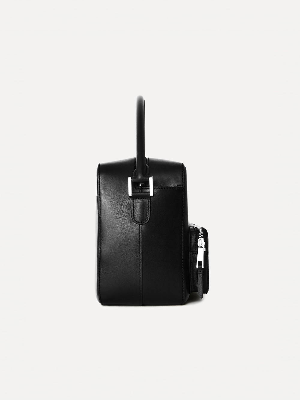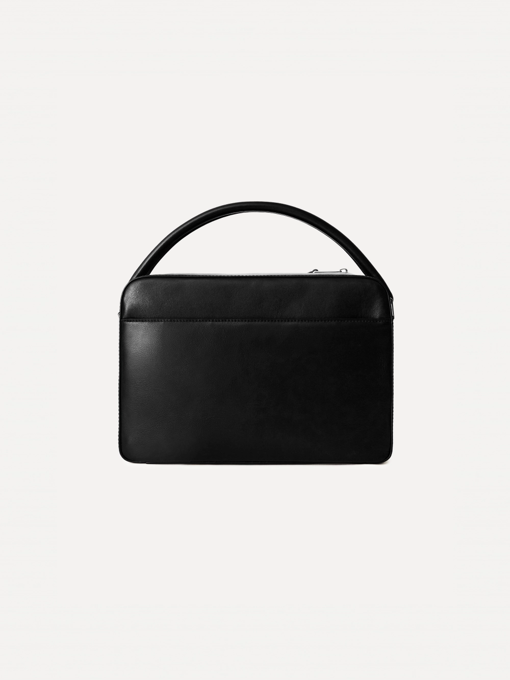 This is the medium-sized version of the highly popular Sander Bag. A tote bag that reinterprets the classic vintage briefcase with a minimalist touch. Crafted from black-toned kip skin with a subtle sheen, the leather offers a refined and stylish look. It is designed in a practical size to carry various essentials. Thoughtfully structured with multi-pocket features including a front zippered pocket, interior compartments, and a magnetic flat pocket at the back to enhance its functionality. With a detachable shoulder strap, the bag can be worn both as a top-handle and crossbody, making it a versatile two-way accessory. Its minimal square shape and compact size make it an ideal piece for everyday use. |