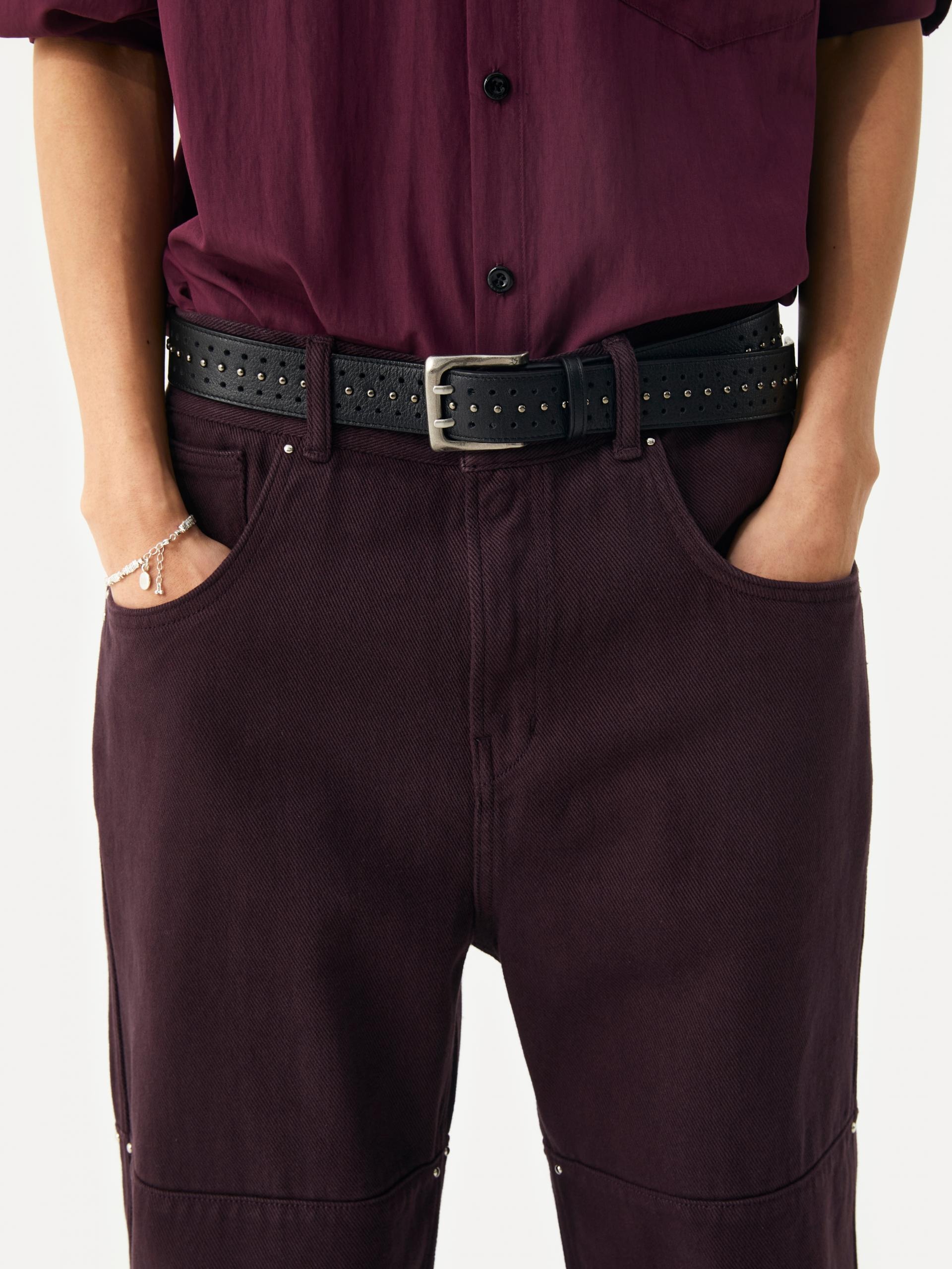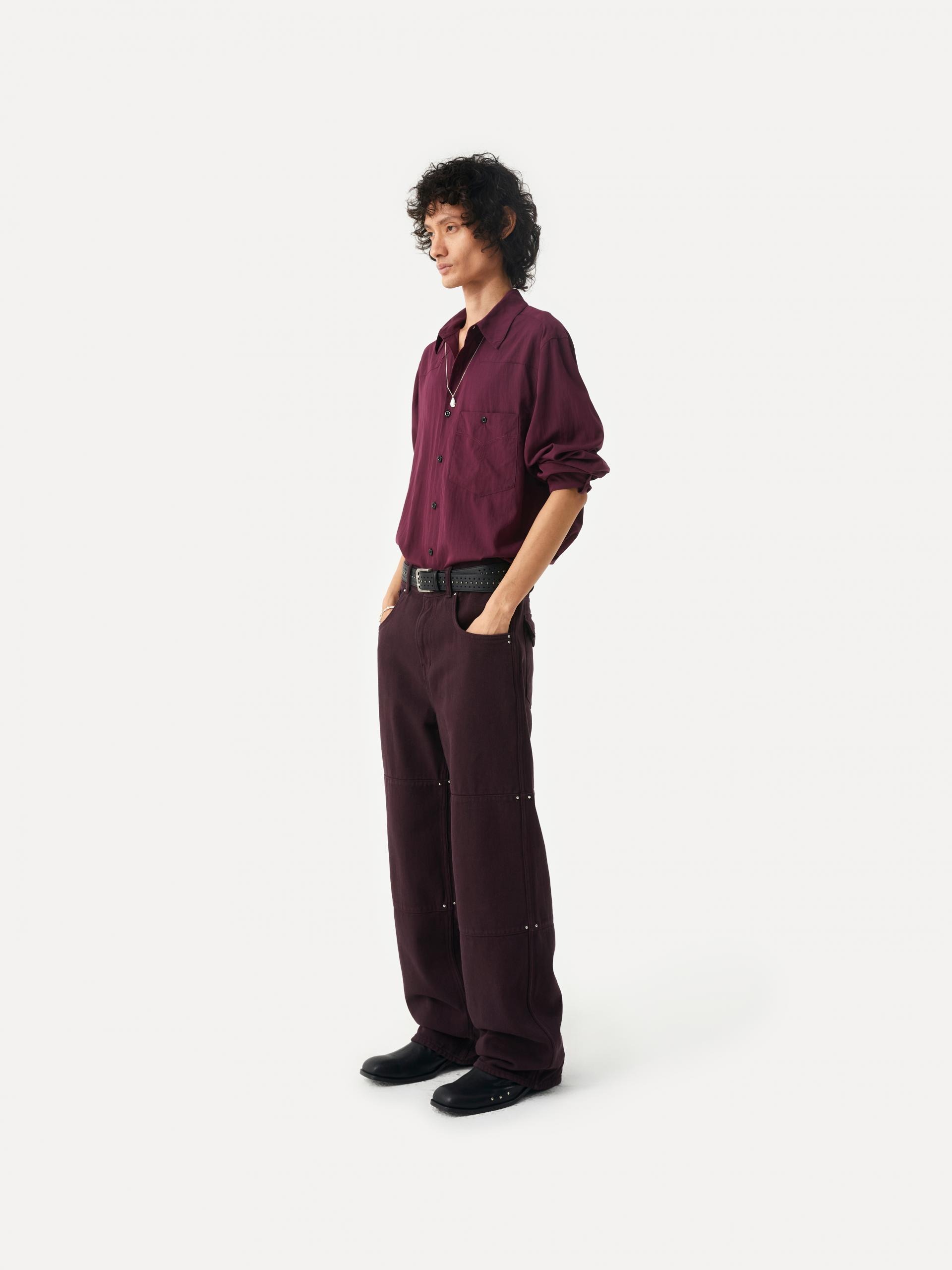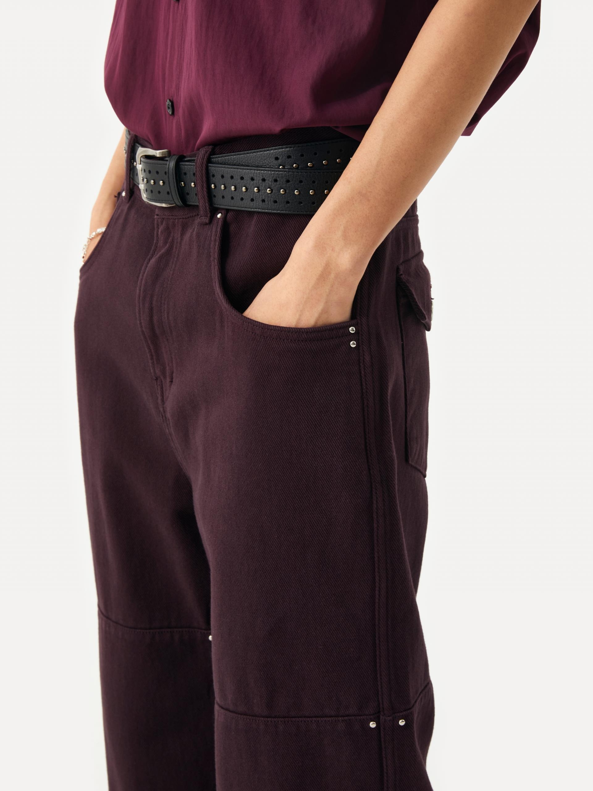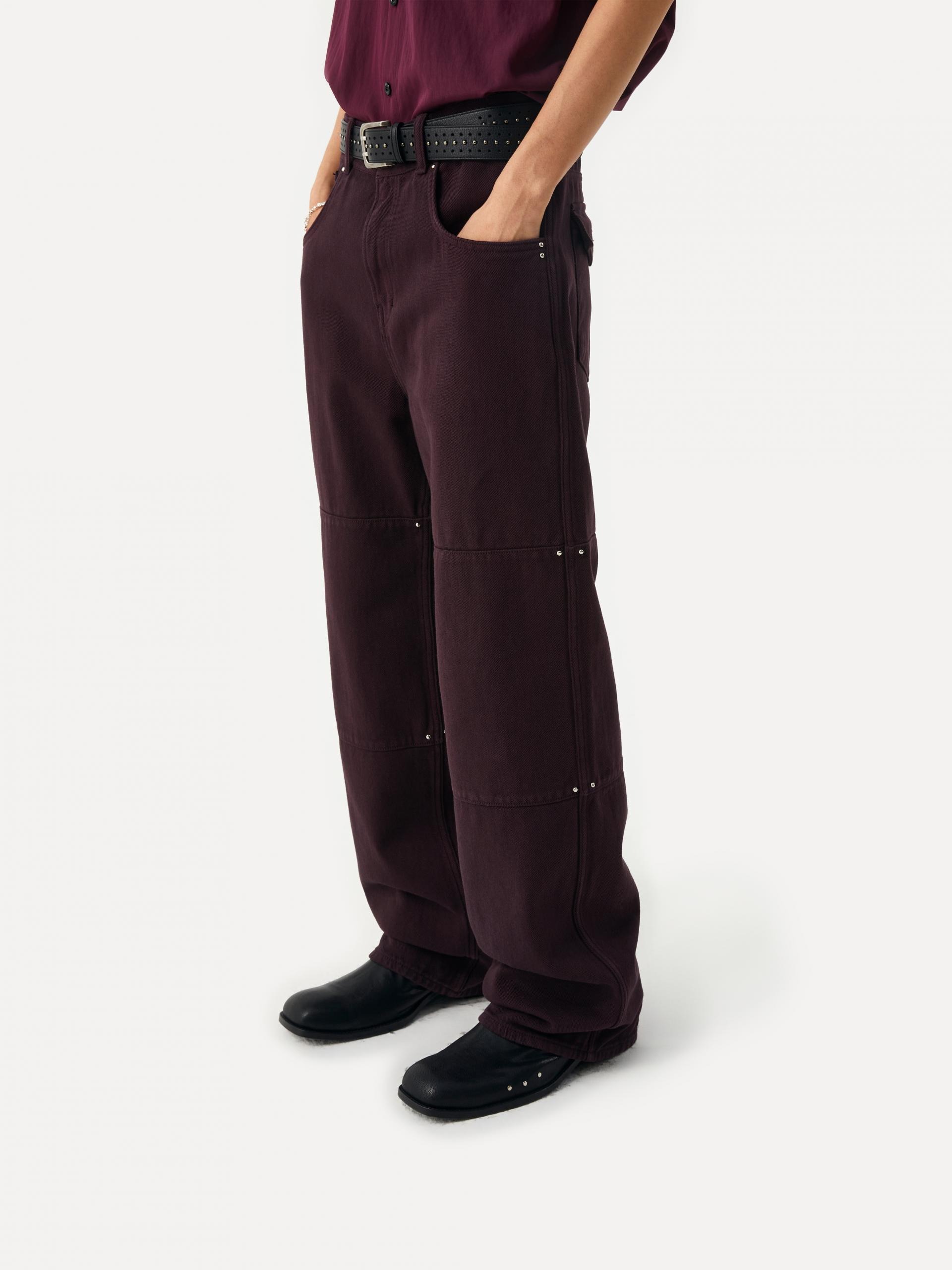 These wide-fit jeans feature a rich plum-colored wash and stud details. Horizontal panel seams create a subtle, three-dimensional effect, while small silver studs on the side seams add refined accents. The combination of a wide silhouette, seasonal color, and stud detailing delivers a stylish and versatile piece for various outfits. · Due to the dyed finishing process, color transfer may occur; avoid friction with light-colored clothing or accessories. |