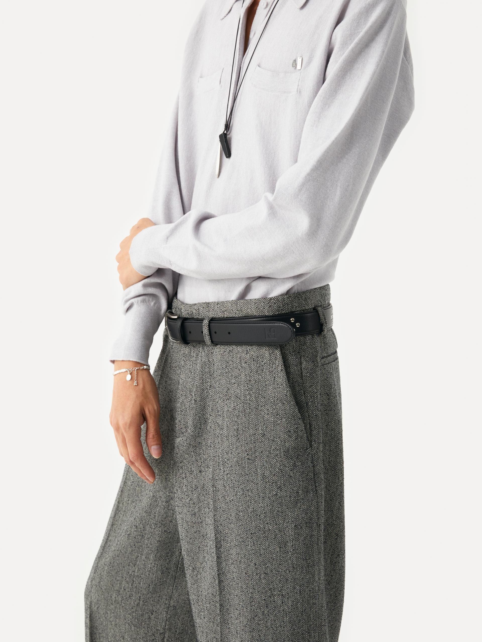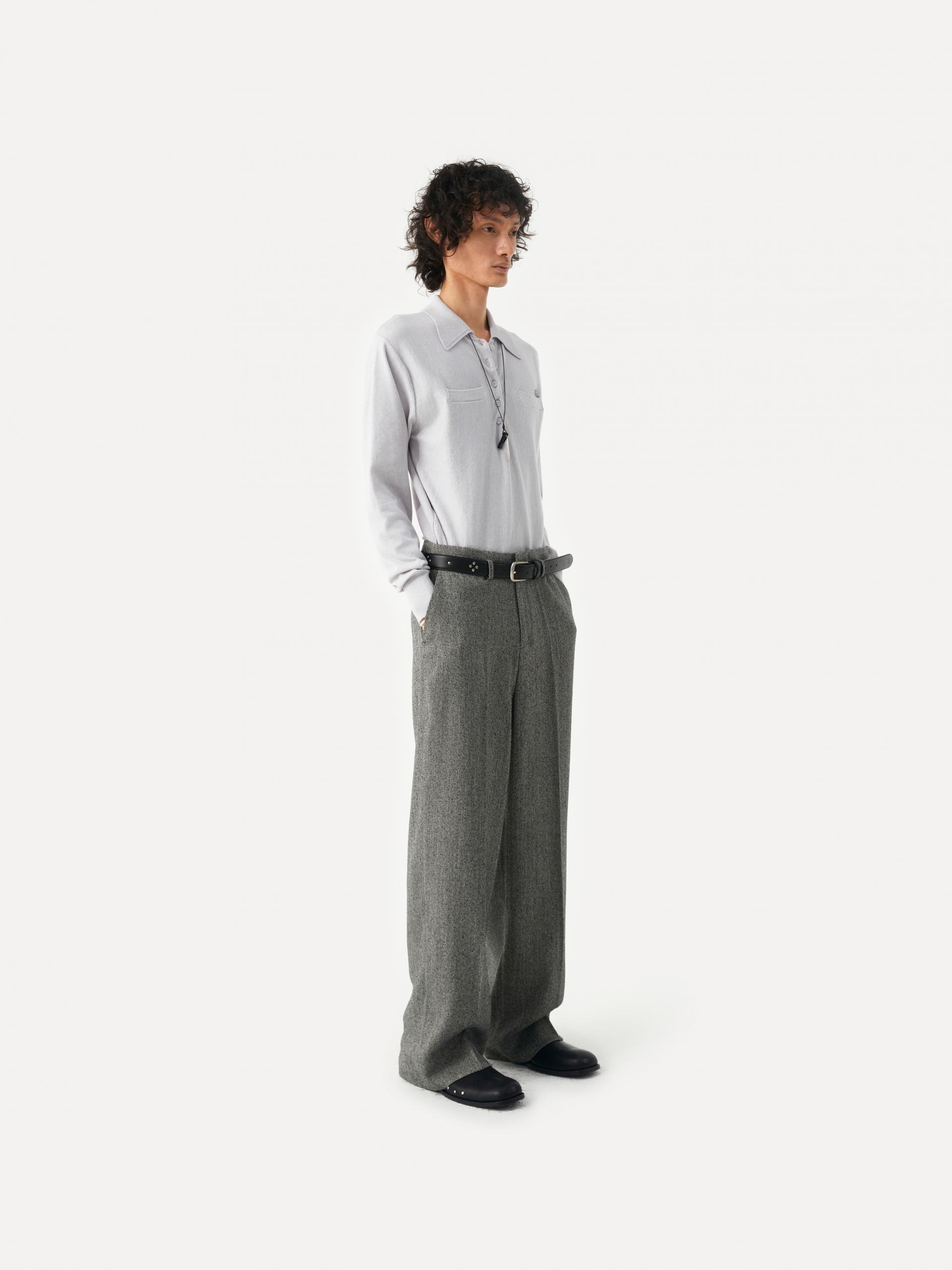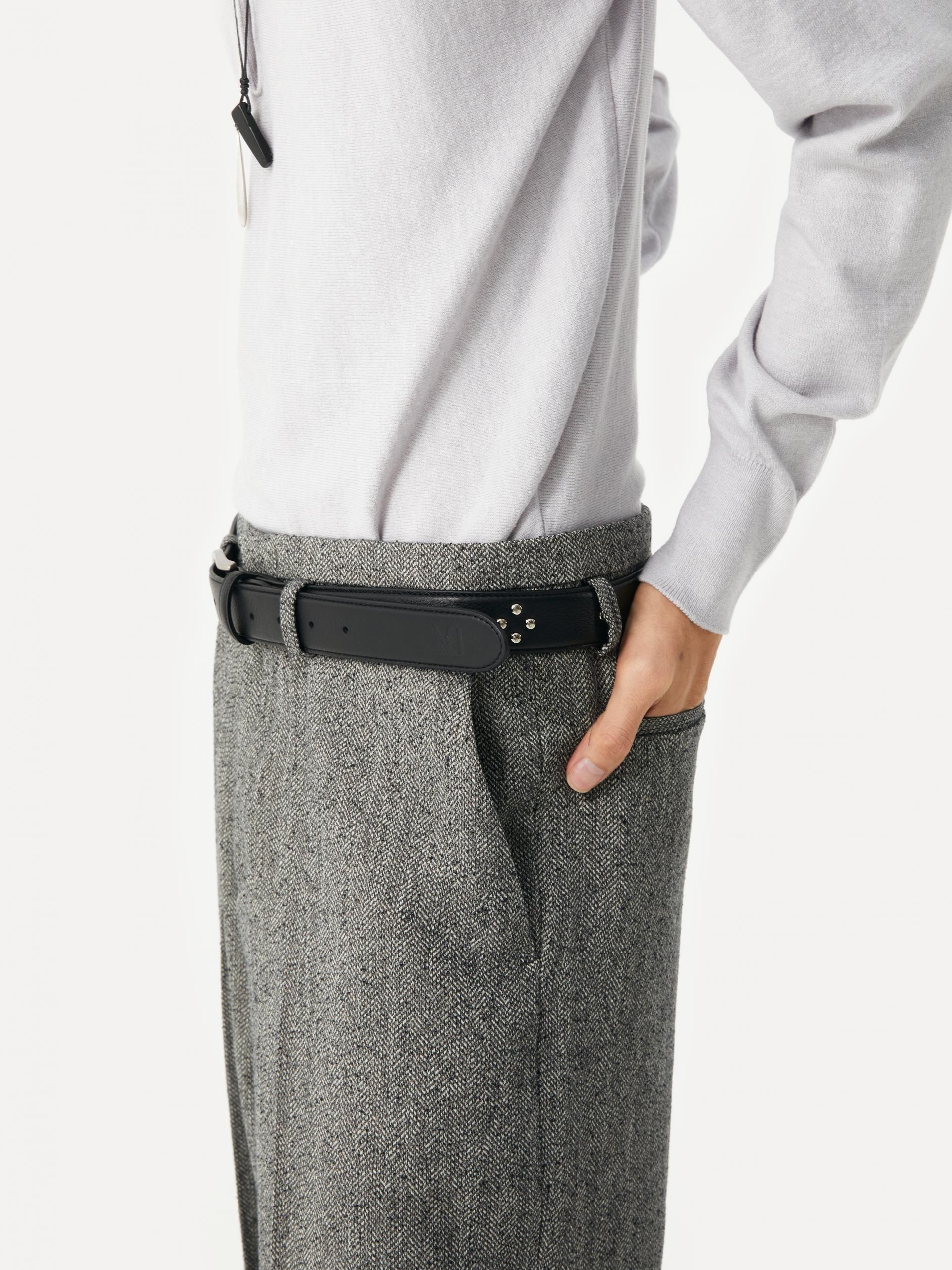 These wide-fit pants showcase a modern aesthetic through refined silhouette and details. The combination of a wide leg, slim waistline, and slightly lower belt loops creates a sophisticated look. The detachable cowhide belt, featuring a diamond-shaped stud pattern, adds a stylish accent on its own, making this piece versatile and ideal for various styling options. |