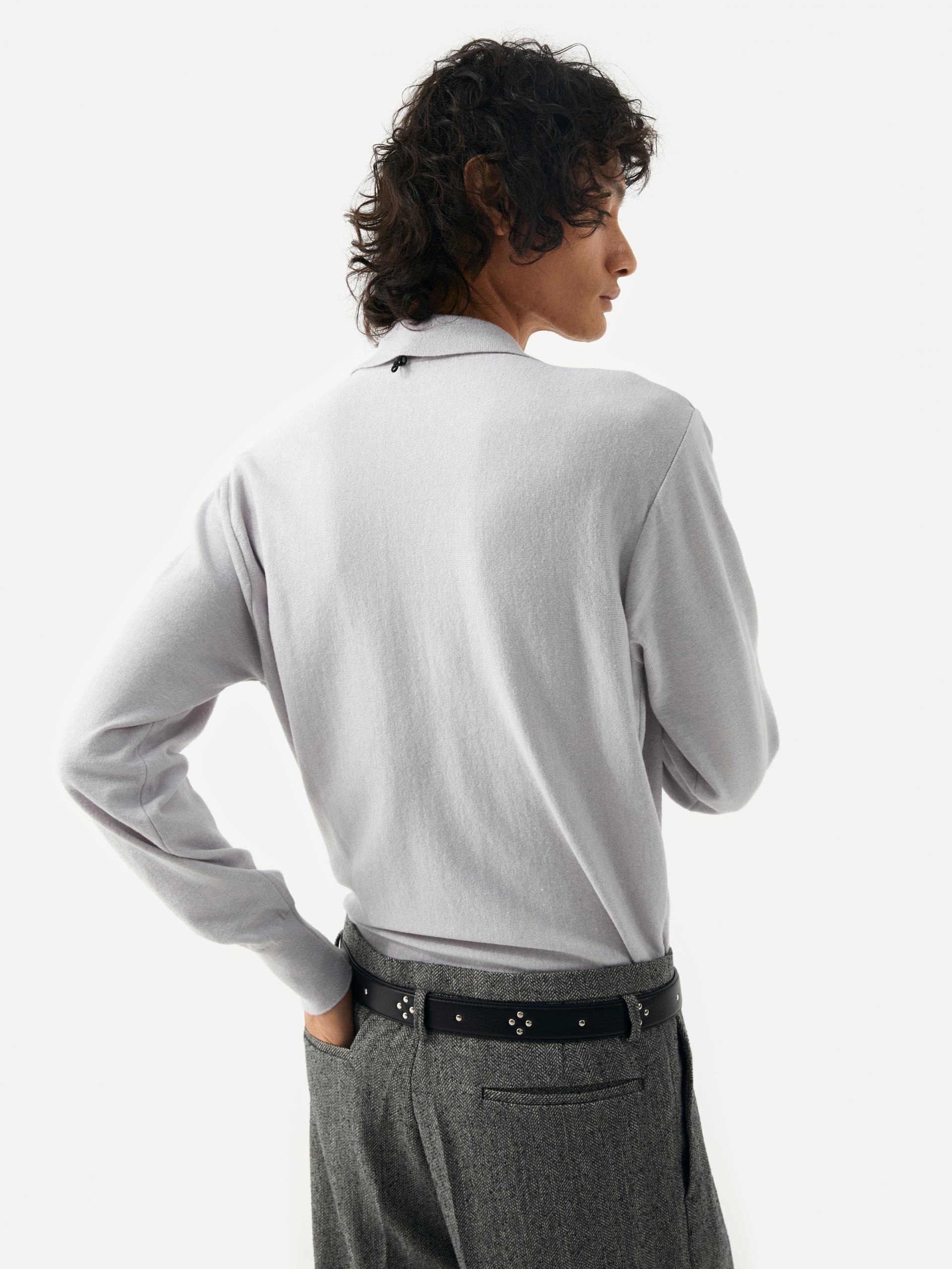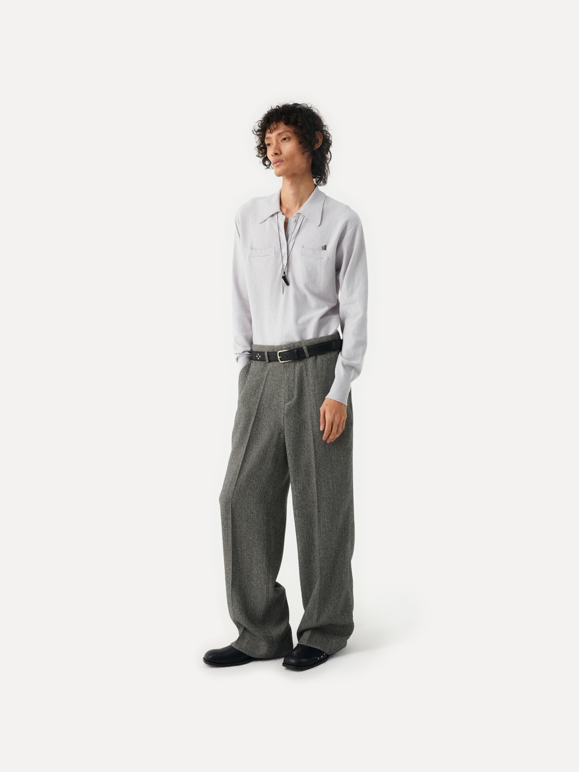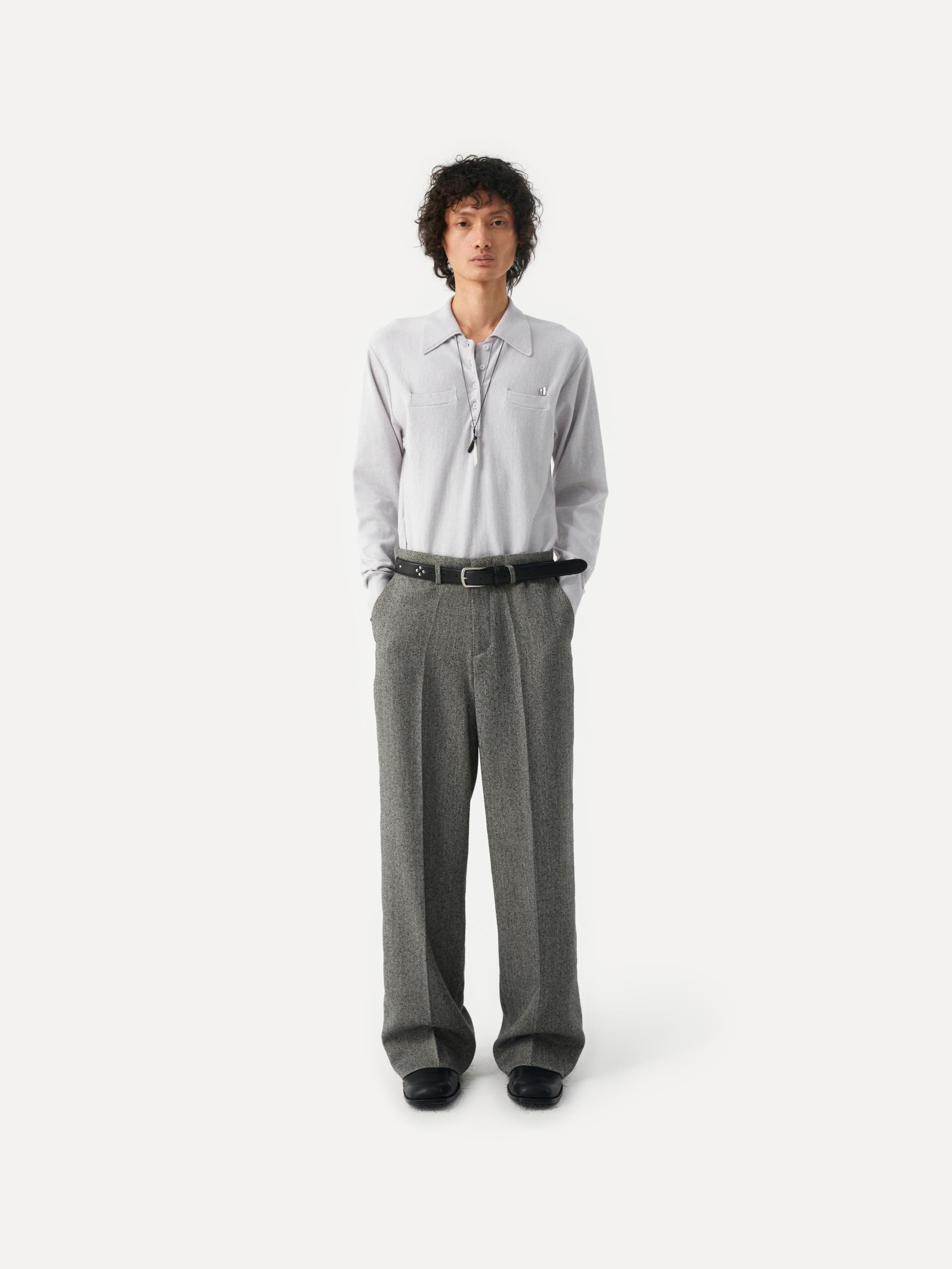 These wide-fit pants showcase a modern aesthetic through refined silhouette and details. The combination of a wide leg, slim waistline, and slightly lower belt loops creates a sophisticated look. The detachable cowhide belt, featuring a diamond-shaped stud pattern, adds a stylish accent on its own, making this piece versatile and ideal for various styling options. |